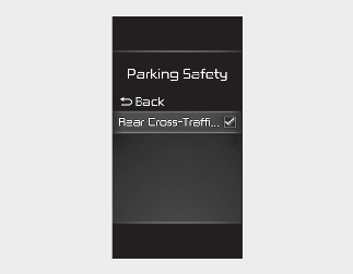 Atunci când contactul sau butonul ENGINE START/STOP se află în poziția ON, selectați ‘'Driver Assistance → Parking Safety → Rear Cross-Traffic Safety’ din meniul Settings pentru a porni sistemul Avertizare coliziune trafic în spate și deselectați pentru a opri funcția.