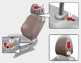 Prima o botão de desbloqueio do encosto de cabeça (3) puxando este último, simultaneamente, para cima (4).
