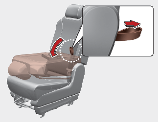 Puxe a alavanca ou correia de reclinação do encosto do banco e, em seguida, recline o banco no sentido da dianteira do veículo.