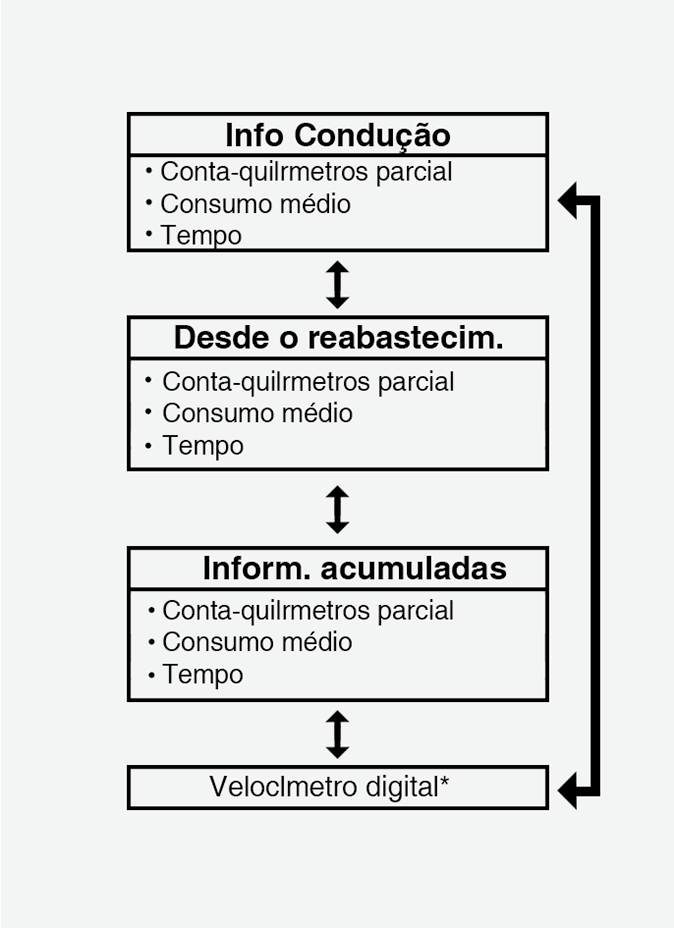 Este ecrã indica a distância da viagem, a eficiência média de combustível e a eficiência instantânea de combustível (ou o tempo de condução total) desde o reabastecimento.