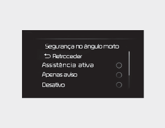 “Warning only” (Apenas aviso): A Assistência à prevenção de colisão em ângulos mortos avisará o condutor com um aviso sonoro, e a assistência à travagem será aplicada, dependendo dos níveis de risco de colisão. A travagem não será assistida, pelo que o condutor controlará diretamente o veículo.