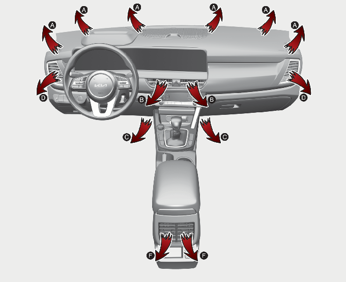 L’essentiel du flux d’air est dirigé vers le sol et le pare-brise, tandis qu'une petite partie est dirigée vers les dégivreurs des vitres latérales et les aérations arrière.