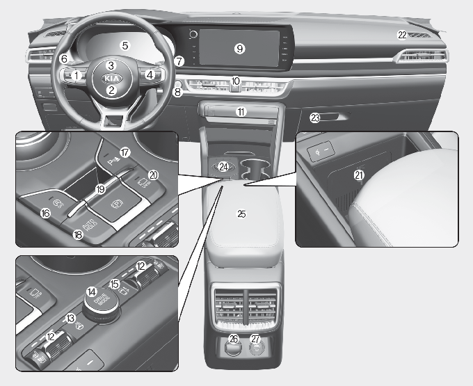 * 본 도안은 실제 차량과 다를 수 있습니다. (스위치의 형상 및 배열은 사양 적용에 따라 달라질 수 있습니다.)
