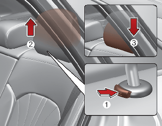 내릴 때는 잠금해제 버튼(2)을 누른 채로 헤드레스트를 위에서 누르십시오(3).