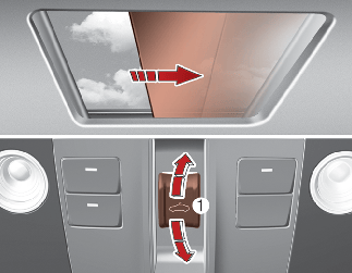 파노라마 선루프가 닫힌 상태에서 파노라마 선루프 조절 레버를 앞쪽으로 밀거나 아래로 당기면 블라인드가 슬라이딩 되면서 닫힙니다.