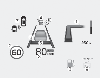 * 위의 그림은 설명을 위한 샘플로 실제 차량에 적용된 헤드업 디스플레이 형상과 다를 수 있습니다.