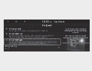 주차 중 이벤트 알림 서비스 사용을 위해서는 인포테인먼트 시스템 화면에서 [빌트인 캠] 진입 후 「메뉴→빌트인 캠 설정→녹화→주차 중 녹화→주차 중 이벤트 알림」을 설정 해주시기 바랍니다.
