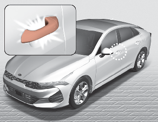 계기판 또는 인포테인먼트 시스템(사양 적용 시)의 사용자 설정 모드에서 [웰컴 미러/라이트]의 [운전자 접근 시]가 설정 되어 있을 때, 스마트 키를 휴대하고 도어 바깥 손잡이에 1 m 이내 접근 하면 켜집니다.