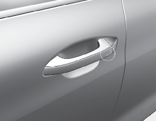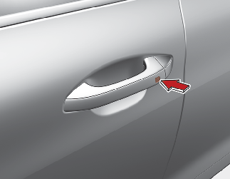 스마트 키를 휴대하고 앞좌석 도어의 바깥 손잡이에 있는 도어 잠금/잠금 해제 버튼(버튼 타입)을 누르거나 앞좌석 도어의 바깥 손잡이에 있는 음각 부분으로 되어 있는 도어 잠금 센서부(터치센서 타입)를 터치하십시오.