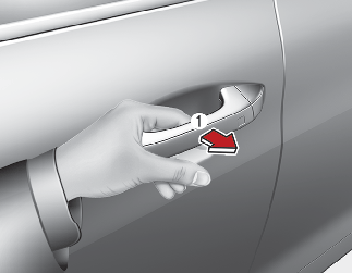 스마트 키를 휴대하고 앞좌석 도어의 바깥 손잡이에 있는 도어 잠금/잠금 해제 버튼(버튼 타입)을 누르거나 도어 핸들 포켓(1) 안에 손을 넣어 바깥 손잡이 안쪽에 위치한 도어 잠금 해제 센서부(터치센서 타입)를 터치하십시오.