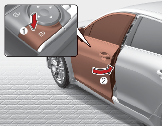 키를 사용하지 않고 도어를 잠글 때는 운전석(또는 동승석)의 중앙 도어 잠금 스위치(1)를 이용하여 도어를 잠그고, 도어를 밀어서 닫으면(2) 잠깁니다. 확실히 잠겼는지 확인하십시오.