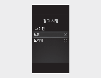 ‘보통’ 을 선택하면 전방 충돌방지 보조 의 경고를 민감하게 설정합니다 . ‘보통’ 상태의 경고가 너무 민감하게 느껴지면, ‘느리게’로 변경하여 사용하십시오. 전방 차량이 급제동 하는 경우에는, 비록 ‘보통’으로 설정했더라도 경고가 느린 것 처럼 느껴질 수 있습니다.