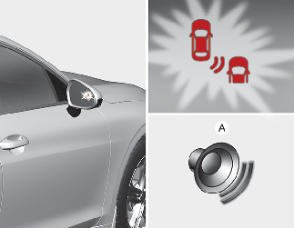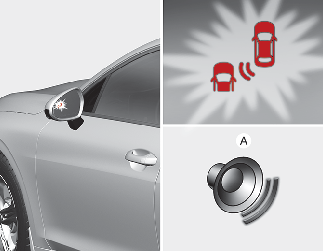 일정 거리 내 자차 후측방에 차량을 감지하면 실외 미러와 헤드업 디스플레이(사양 적용 시)에 경고등이 켜집니다.