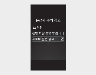 시동 「ON」 상태에서 계기판 또는 인포테 설정 메뉴에서 「운전자 보조→경고 시점→보통/느리게」를 선택하면 운전자 주의 경고 시점을 변경할 수 있습니다.