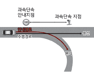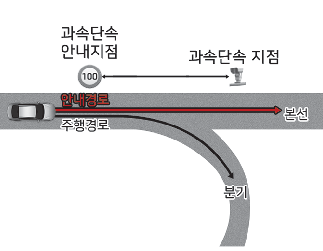 설정한 경로(본선 유지)의 과속단속 카메라 정보에 의해 고속도로 안전구간 자동감속은 작동합니다. 하지만, 전용도로 분기선으로 진입하여 경로 이탈이라고 판단하면 고속도로 안전구간 자동감속은 작동하지 않습니다. 이때, 원하지 않는 감속 제어가 일시적으로 발생할 수 있습니다.