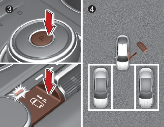 「P」(주차)단으로 변속하고 원격 스마트 주차 보조 버튼(