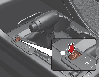배터리가 방전되었거나 또는 시동 「ON」 상태가 아니면 브레이크 페달을 밟아도 변속 레버가 「P」(주차)위치에서 「R」(후진) 위치로 조작되지 않습니다. 이때는 변속 레버 앞쪽에 위치한 「Shift Lock RELEASE」버튼(1)을 누르면서 변속 레버 버튼을 눌러 변속 레버를 움직이면 다른 위치로 조작이 가능합니다.
