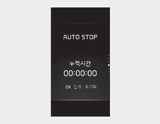 AUTO STOP 누적시간은 시:분:초로 표시됩니다. AUTO STOP 누적시간은 초기화하기 전까지 누적되며, 스티어링 휠의 「OK」 버튼을 길게 누르면 초기화됩니다.