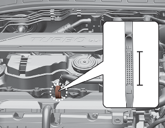 시동을 끄고 엔진 후드를 열고 엔진 오일 주입구 캡 및 레벨 게이지를 뽑아 오일 팬의 유면이 안정될 때까지(약 15분) 기다리십시오.