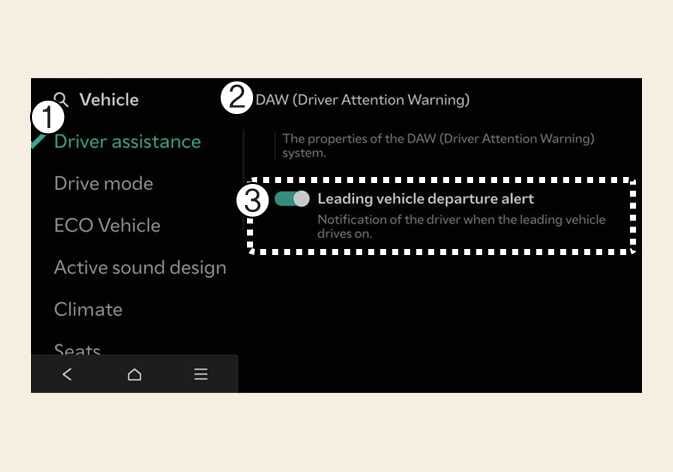Chaque fois que le véhicule est allumé, l’ Alerte de démarrage du véhicule de tête est activée. (Pour l’Europe, la Russie)