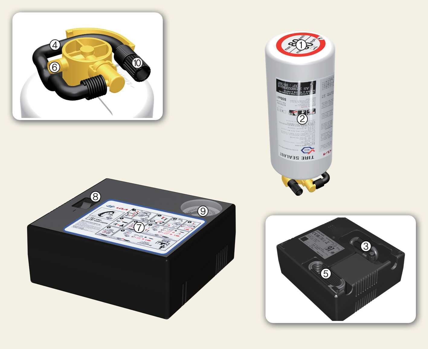 Les connecteurs, le câble et le flexible de gonflage se trouvent dans le boîtier du compresseur.