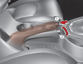 To release the parking brake, first apply the foot brake and pull up the parking brake lever slightly. Secondly depress the release button (1) and lower the parking brake lever (2) whilst holding the button.
