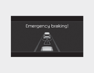 To warn the driver that emergency braking will be assisted, the 'Emergency braking' warning message will appear on the cluster, and an audible warning will sound and the steering wheel will vibrate.