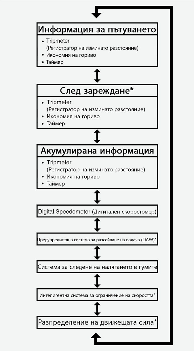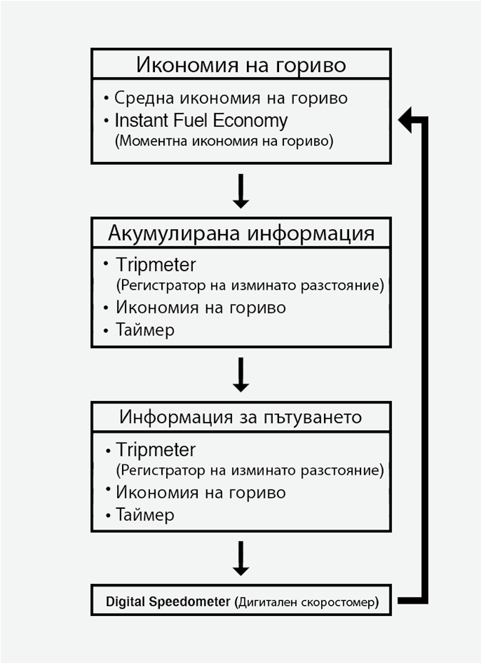 Този дисплей показва разстоянието за пътуване, средната ефективност на гориво и информацията за общото време на шофиране за един цикъл на стартиране.