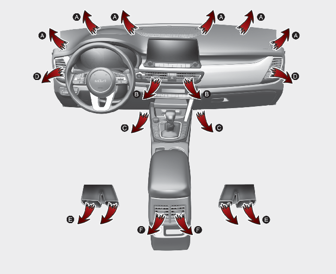 * D 방향으로 나오는 바람은 강약의 차이는 있으나 모든 선택 모드에서 나오므로 원하지 않을 경우 개폐 레버를 이용하여 닫으십시오.
