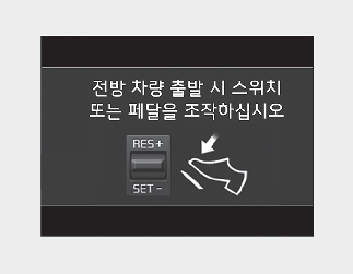 차량 정체가 발생하는 구간에서 스마트 크루즈 컨트롤 기능으로 일정거리를 유지하던 앞 차량이 정차를 하게 되면, 앞 차량 뒤에 정차를 합니다. 앞 차량이 출발하면 다시 거리를 유지하며 따라갑니다. 단, 정차 후 3초 이후에는 가속 페달을 밟거나 「RES +」 또는 「SET -」 스위치를 조작하면 재출발합니다.