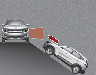 오르막이나 내리막 경사로 또는 그 근처에서는 후방 좌측 또는 우측에서 접근하는 차량을 인식하지 못해 시스템의 경고나 브레이크 제어가 늦게 작동하거나 작동하지 않을 수 있습니다. 주변을 직접 확인하고 운전하십시오.