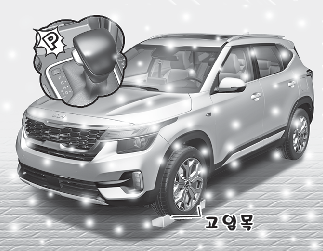 매우 추운 날씨의 주·정차 시 주차 브레이크를 작동시켜 놓으면 브레이크 장치가 얼어 붙어버릴 우려가 있으므로 주차 브레이크는 가능한 풀어 놓은 상태에서 주차하십시오. 경사없는 평지에 변속 레버를 「P」 (주차) 위치로, 타이어에는 고임목을 받쳐 차가 움직이지 않도록 하십시오.