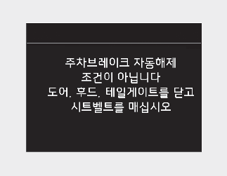 운전자가 안전벨트 미착용 상태이거나 운전석 도어가 열린 상태, 「D」위치에서 엔진 후드가 열린 상태 또는 「R」위치에서 트렁크/테일게이트가 열린 상태에서 시스템 작동 조건 불만족으로 자동 해제가 안될 때, LCD 표시창에 경고 문구가 뜨고 경고음이 1회 울립니다.