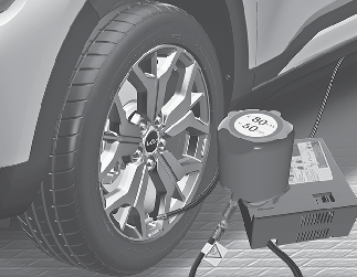타이어 임시수리장치는 시동 상태에서 사용하십시오. 그렇지 않으면 컴프레서 작동 시 차량 배터리 전원 사용으로 배터리가 방전될 수 있습니다.