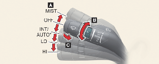 Klaasipuhastite kiiruse reguleerimiseks keerake kiiruse juhtimise lülitit (B).