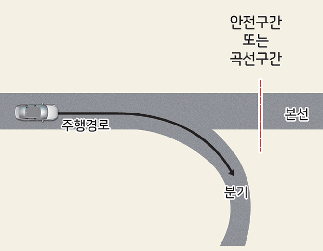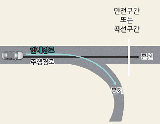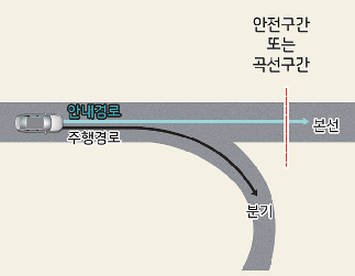 안내 경로(본선)와 주행 경로(분기)에 차이가 발생하면 전용도로 본선의 안전구간 또는 곡선구간 정보에 의해 고속도로 안전구간 자동감속 또는 고속도로 곡선구간 자동감속 기능이 일시적으로 작동할 수 있습니다.