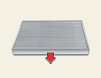 공조장치용 에어필터 교환 시 받침대 및 필터의 방향이 화살표 표시(↓)가 아래로 향하도록 장착하십시오.