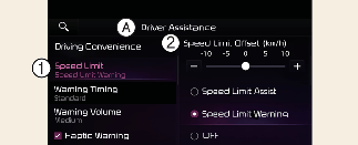 Varningsfunktionen för hastighetsgräns varnar föraren när körhastigheten överskrider hastigheten vid vilken den inställda förskjutningen är tillagd. Om du vill att varningsfunktionen för hastighetsgräns ska varna dig omedelbart när körhastigheten överskrider hastighetsgränsen, ställ in förskjutningen på 0.