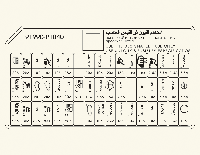En la parte interior de la cubierta del panel de fusibles/relés, encontrará la etiqueta de los fusibles y relés que describe el nombre y la capacidad de los mismos.