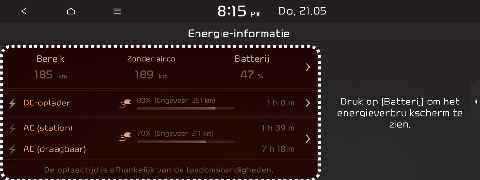U kunt controleren wat de actieradius is, wat het resterende batterijvermogen is en wat de verwachte laadtijd voor elk type lader is.
