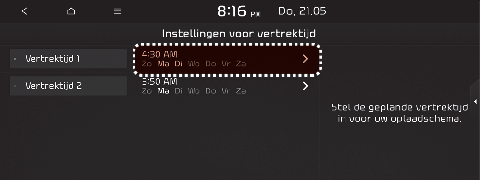 Departure time (vertrektijd): Stel het tijdstip in waarop u de auto wilt starten na het laden van de batterij.