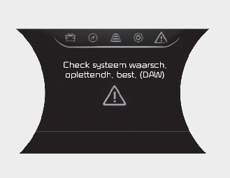 Wanneer de waarschuwingsmelding "Check Driver Attention Warning (DAW) system" (Waarschuwingssysteem voor de aandacht van de bestuurder (DAW) controleren) verschijnt, werkt de functie niet goed. Laat de functie in dat geval nakijken door een professionele werkplaats. Kia raadt aan om een officiële Kia-dealer/servicepartner te bezoeken.
