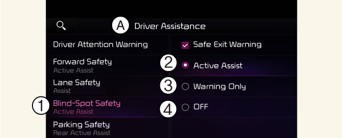 Keď je vozidlo zapnuté, vyberte možnosti Nastavenia → Asistenčný systém → Sledovanie mŕtveho uhla na prístrojovom paneli alebo možnosti Nastavenia → Vozidlo → Asistenčný systém → Sledovanie mŕtveho uhla na infotainment systéme a nastavte, či sa jednotlivé funkcie majú používať.