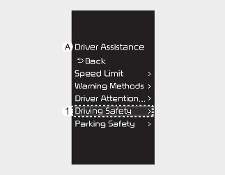 Keď je vozidlo zapnuté, zvoľte možnosti Používateľské nastavenia → Asistenčný systém → Bezpečnosť pri jazde na prístrojovom paneli alebo možnosti Nastavenie → Vozidlo → Asistenčný systém → Bezpečnosť pri jazde na infotainment systéme.