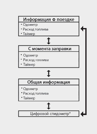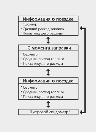 На дисплее отображается пройденное расстояние, средняя и моментальная эффективность использования топлива (или общее время в пути) после заправки.