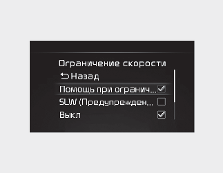 Если выбран пункт «Speed Limit Warning» (Предупреждение об ограничении скорости), интеллектуальная система контроля ограничения скорости будет информировать водителя об ограничениях скорости и дополнительных дорожных знаках. Она также будет предупреждать водителя в случае превышения скоростного режима. Скорость, заданная в «Smart Cruise Control» (Система интеллектуального круиз-контроля), автоматически не корректируется. Водителю следует вручную корректировать скорость.
