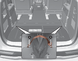 Подсоедините крепежный ремень к отбойной пластине (A), находящейся на нижней левой/правой стороне задней поверхности третьего ряда сидений.