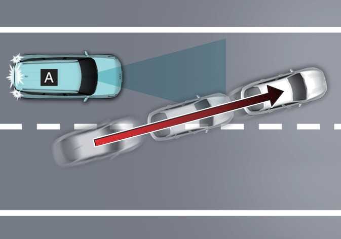 [A]: Vaše vozidlo, [B]: Predné vozidlo Ak vozidlo pred vaším vozidlom náhle vrazí pred vás, upozornenie na rozjazd vozidla vpredu nemusí správne fungovať. |