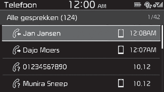 Als uw mobiele telefoon met het systeem is verbonden, kunt u iemand bellen door een naam uit uw oproepgeschiedenis of lijst met contacten te selecteren.