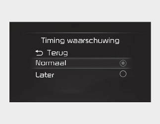 Selecteer voor het waarschuwingsmoment 'Late' ('Laat') wanneer er weinig verkeer is en wanneer uw rijsnelheid laag is.